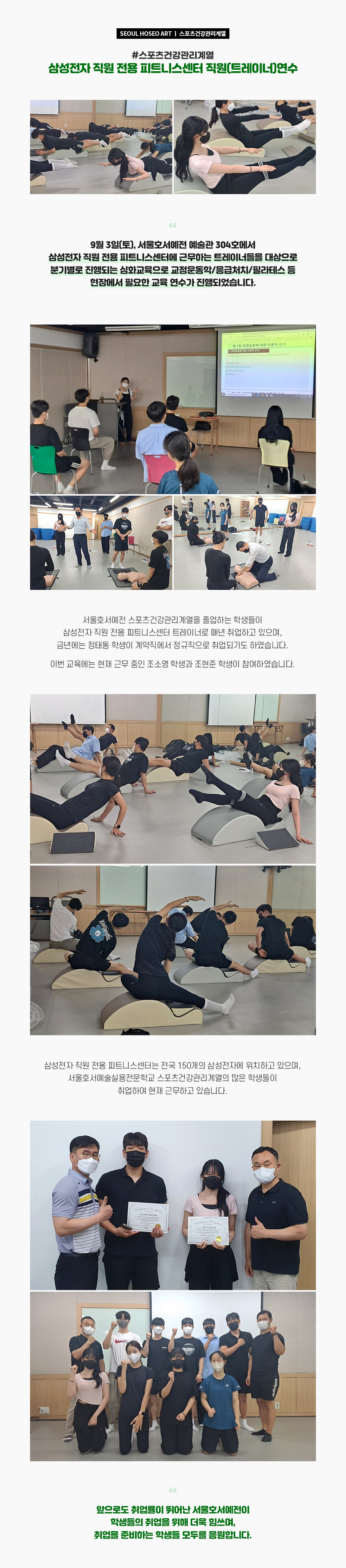 9월 3일(토), 서울호서예전 예술관 304호에서 삼성전자 직원 전용 피트니스센터에 근무하는 트레이너들을 대상으로 분기별로 진행되는 심화교육으로 교정운동학/응급처치/필라테스 등 현장에서 필요한 교육 연수가 진행되었습니다.
