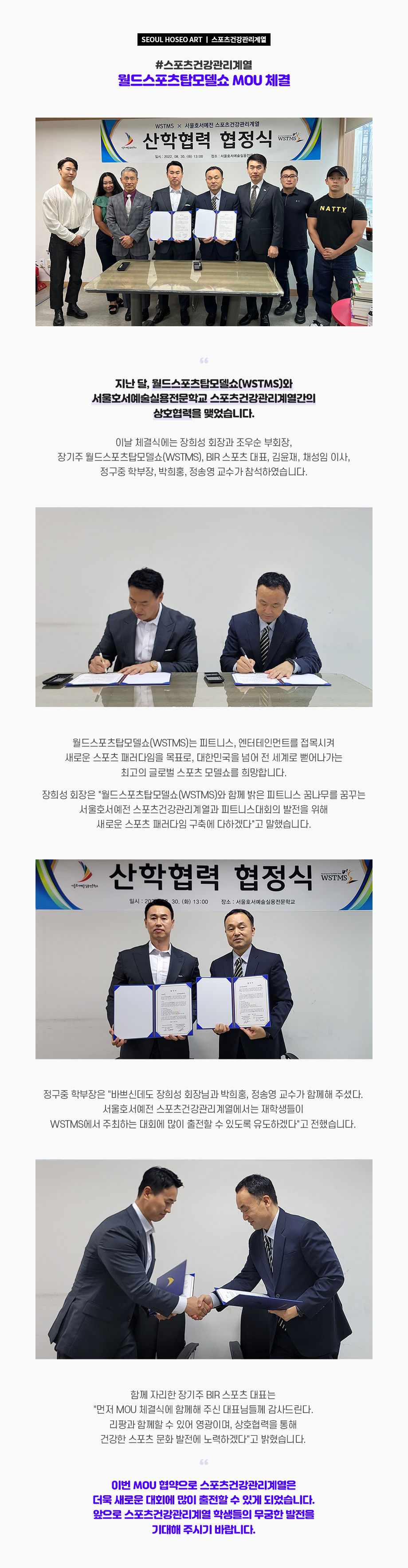 지난 달, 월드스포츠탑모델쇼(WSTMS)와 서울호서예술실용전문학교 스포츠건강관리계열간의 상호협력을 맺었습니다. 이날 체결식에는 장희성 회장과 조우순 부회장, 장기주 월드스포츠탑모델쇼(WSTMS), BIR 스포츠 대표, 김윤재, 채성임 이사, 정구중 학부장, 박희홍, 정송영 교수가 참석하였습니다.