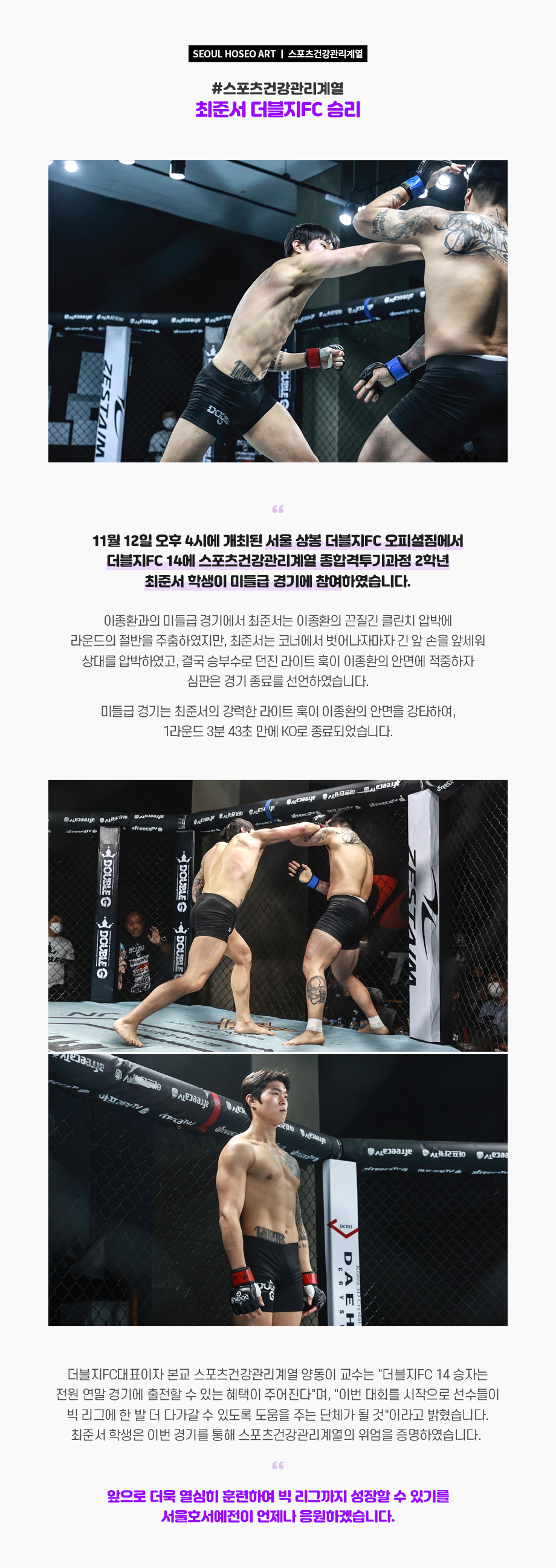 11월 12일 오후 4시에 개최된 서울 상봉 더블지FC 오피셜짐에서 더블지FC 14에 스포츠건강관리계열 종합격투기과정 2학년 최준서 학생이 미들급 경기에 참여하였습니다. 이종환과의 미들급 경기에서 최준서는 이종환의 끈질긴 클린치 압박에 라운드의 절반을 주춤하였지만, 최준서는 코너에서 벗어나자마자 긴 앞 손을 앞세워 상대를 압박하였고, 결국 승부수로 던진 라이트 훅이 이종환의 안면에 적중하자 심판은 경기 종료를 선언하였습니다.