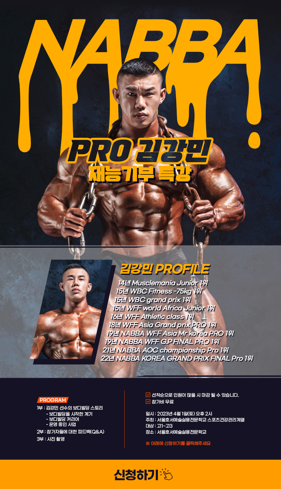 서울호서예술실용전문학교 스포츠건강관리계열 NABBA 프로 김강민 재능기부 특강 신청하기