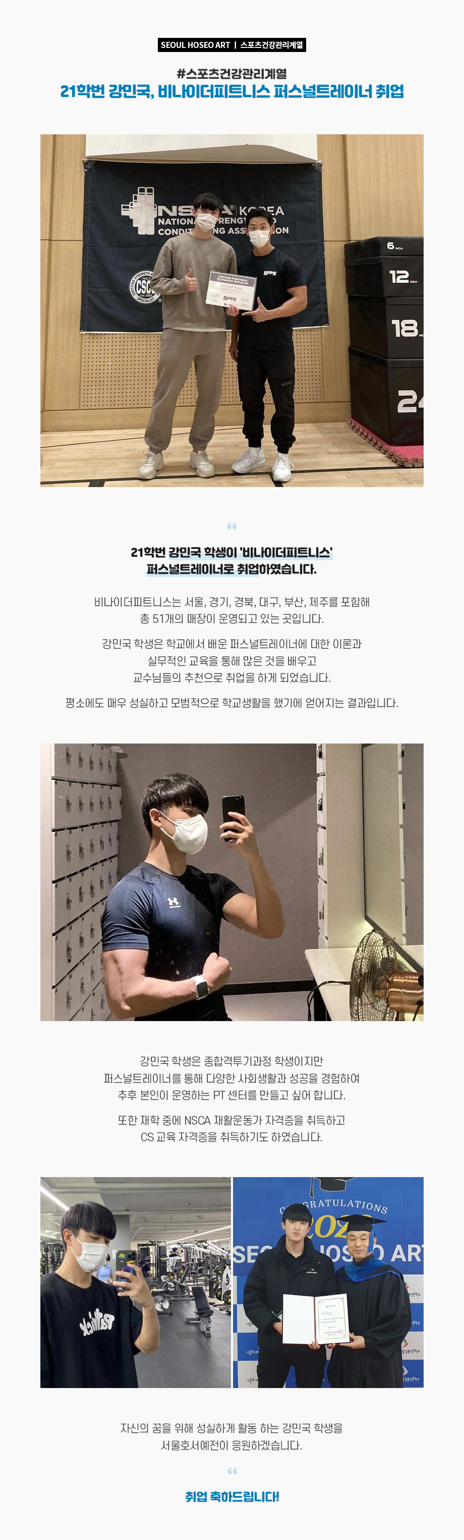 21학번 강민국 학생이 '비나이더피트니스' 퍼스널트레이너로 취업하였습니다. 비나이더피트니스는 서울, 경기, 경북, 대구, 부산, 제주를 포함해 총 51개의 매장이 운영되고 있는 곳입니다. 강민국 학생은 학교에서 배운 퍼스널트레이너에 대한 이론과 실무적인 교육을 통해 많은 것을 배우고 교수님들의 추천으로 취업을 하게 되었습니다.