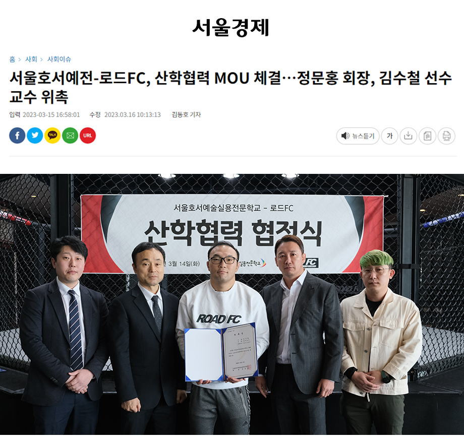 [언론보도] 서울호서예전-로드FC, 산학협력 MOU 체결…정문홍 회장, 김수철 선수 교수 위촉