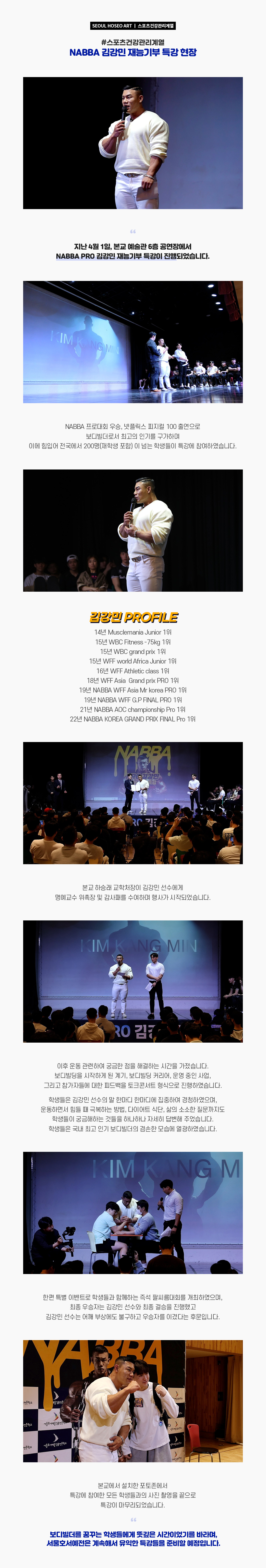 지난 4월 1일, 본교 예술관 6층 공연장에서 NABBA PRO 김강민 재능기부 특강이 진행되었습니다. NABBA 프로대회 우승, 넷플릭스 피지컬 100 출연으로 보디빌더로서 최고의 인기를 구가하며 이에 힘입어 전국에서 200명(재학생 포함) 이 넘는 학생들이 특강에 참여하였습니다.