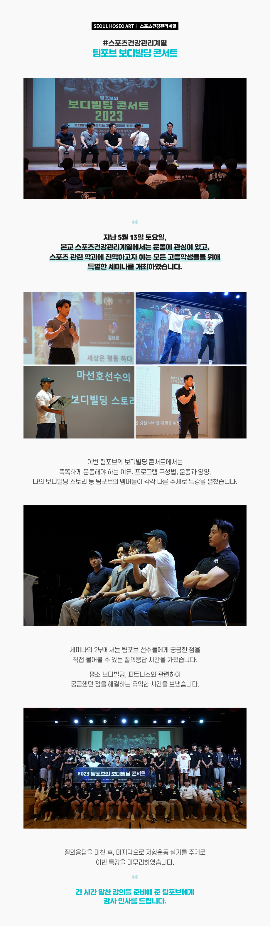 지난 5월 13일 토요일, 서울호서예술실용전문학교 스포츠건강관리계열에서는 운동에 관심이 있고, 스포츠 관련 학과에 진학하고자 하는 모든 고등학생들을 위해 특별한 세미나를 개최하였습니다.