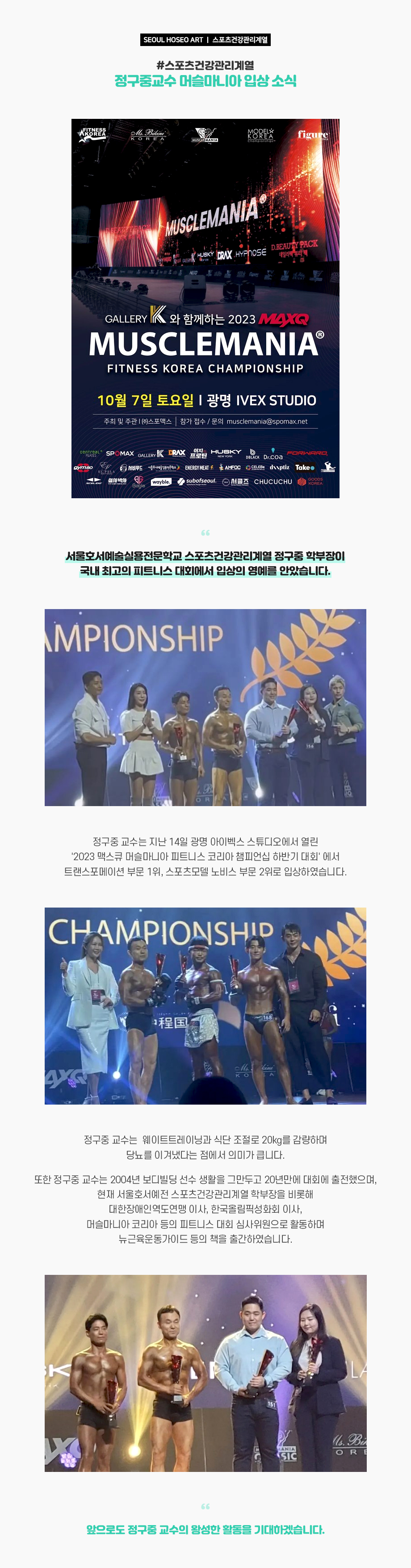 서울호서예술실용전문학교 스포츠건강관리계열 정구중 학부장이 국내 최고의 피트니스 대회에서 입상의 영예를 안았습니다. 정구중 교수는 지난 14일 광명 아이벡스 스튜디오에서 열린 '2023 맥스큐 머슬마니아 피트니스 코리아 챔피언십 하반기 대회'에서 트랜스포메이션 부문 1위, 스포츠모델 노비스 부문 2위로 입상하였습니다.