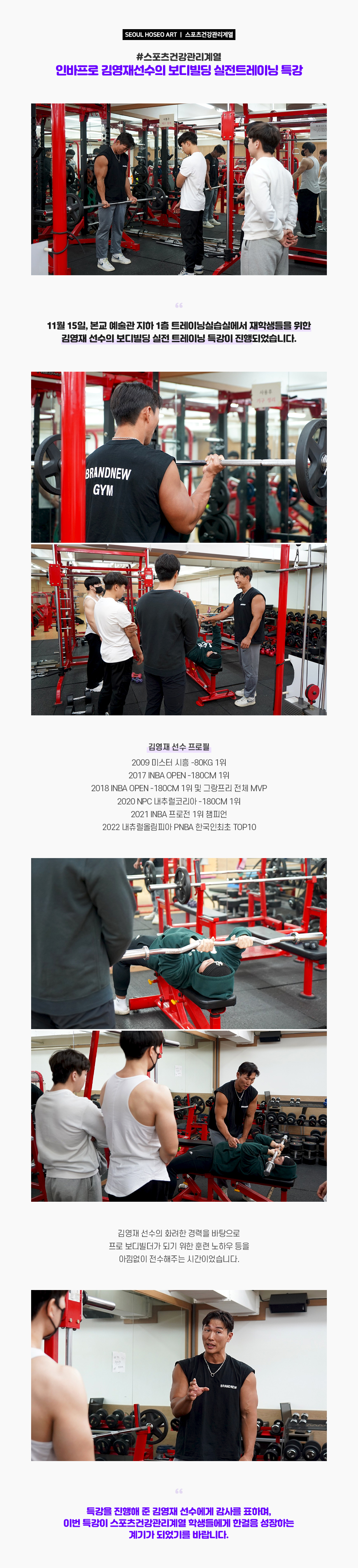 11월 15일, 서울호서예술실용전문학교 예술관 지하 1층 트레이닝실습실에서 재학생들을 위한 김영재 선수의 보디빌딩 실전 트레이닝 특강이 진행되었습니다. [김영재 선수 프로필] - 2009 미스터 시흥 -80KG 1위 / 2017 INBA OPEN -180CM 1위 / 2018 INBA OPEN -180CM 1위 및 그랑프리 전체 MVP / 2020 NPC 내추럴코리아 -180CM 1위 / 2021 INBA 프로전 1위 챔피언 / 2022 내츄럴올림피아 PNBA 한국인최초 TOP10