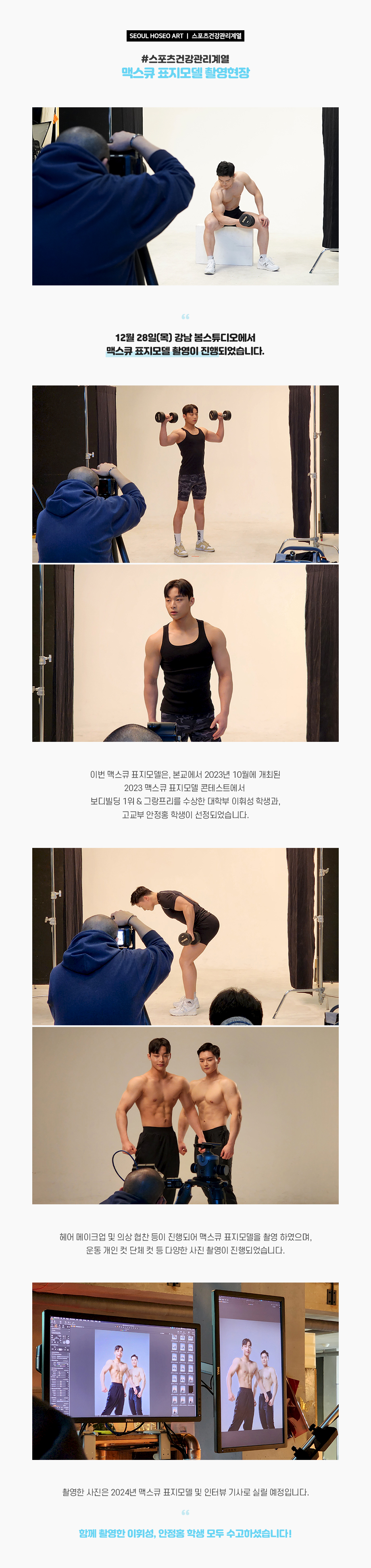 12월 28일(목) 강남 봄스튜디오에서 맥스큐 표지모델 촬영이 진행되었습니다. 이번 맥스큐 표지모델은, 본교에서 2023년 10월에 개최된 2023 맥스큐 표지모델 콘테스트에서 보디빌딩 1위 & 그랑프리를 수상한 대학부 이휘성 학생과, 고교부 안정홍 학생이 선정되었습니다.