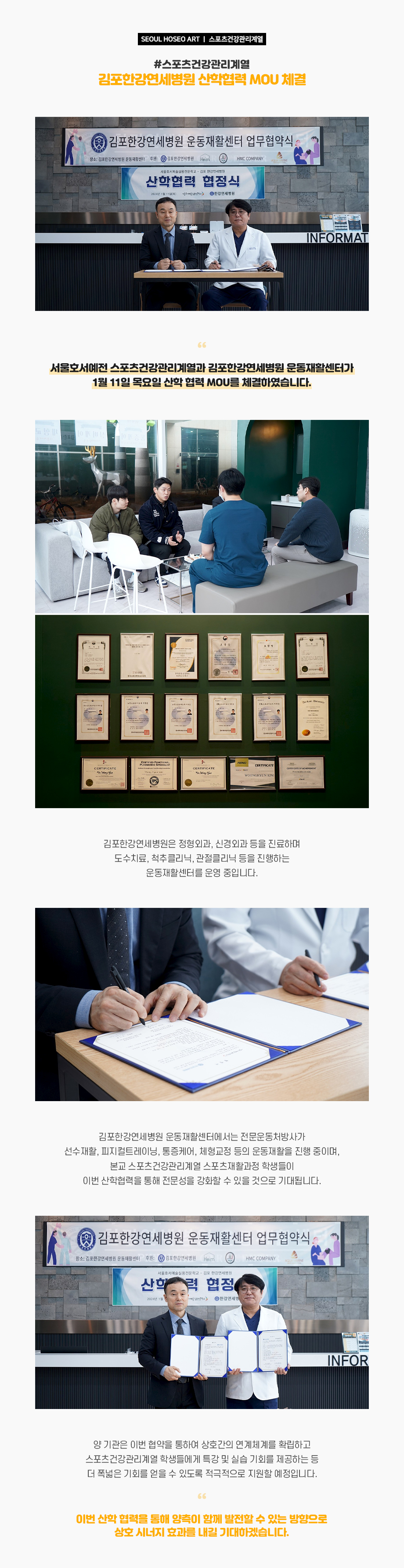 서울호서예전 스포츠건강관리계열과 김포한강연세병원 운동재활센터가 1월 11일 목요일 산학 협력 MOU를 체결하였습니다. 김포한강연세병원은 정형외과, 신경외과 등을 진료하며 도수치료, 척추클리닉, 관절클리닉 등을 진행하는 운동재활센터를 운영 중입니다.