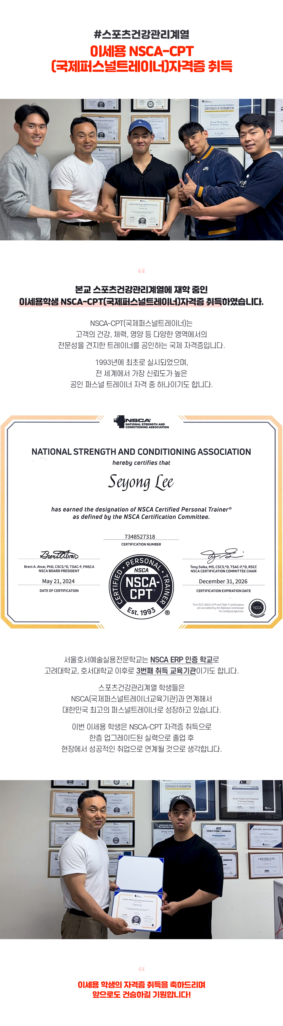 스포츠건강관리계열 이세용 NSCA-CPT(국제퍼스널트레이너)자격증 취득