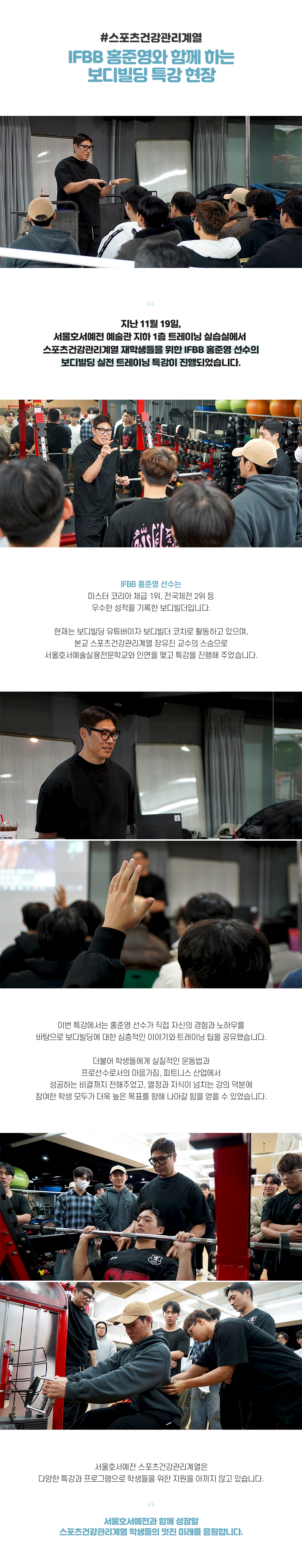 지난 11월 19일, 서울호서예술실용전문학교 예술관 지하 1층 트레이닝 실습실에서 스포츠건강관리계열 재학생들을 위한 IFBB 홍준영 선수의 보디빌딩 실전 트레이닝 특강이 진행되었습니다. IFBB 홍준영 선수는 미스터 코리아 체급 1위, 전국체전 2위 등 우수한 성적을 기록한 보디빌더입니다.