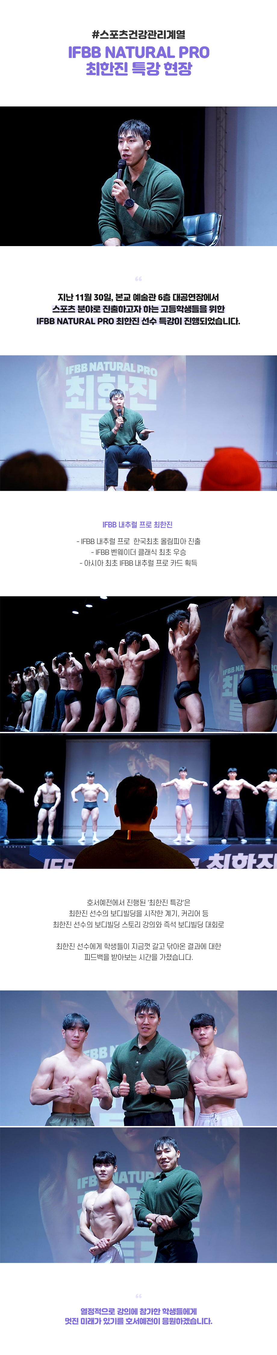 지난 11월 30일, 서울호서예술실용전문학교 예술관 6층 대공연장에서 스포츠 분야로 진출하고자 하는 고등학생들을 위한 IFBB NATURAL PRO 최한진 선수 특강이 진행되었습니다.