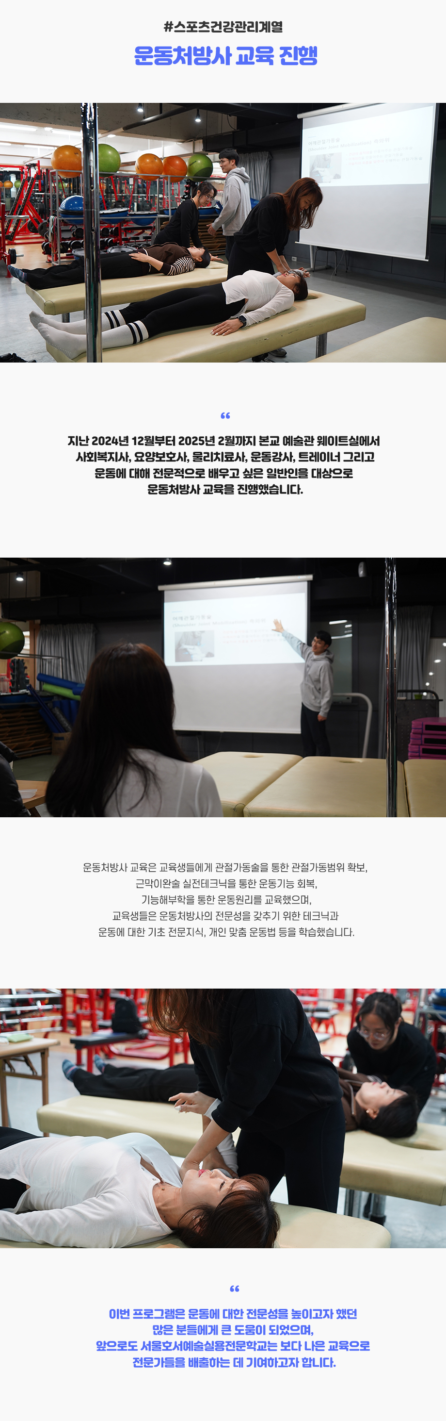 지난 2024년 12월부터 2025년 2월까지 본교 예술관 웨이트실에서 사회복지사, 요양보호사, 물리치료사, 운동강사, 트레이너 그리고 운동에 대해 전문적으로 배우고 싶은 일반인을 대상으로 운동처방사 교육을 진행했습니다.