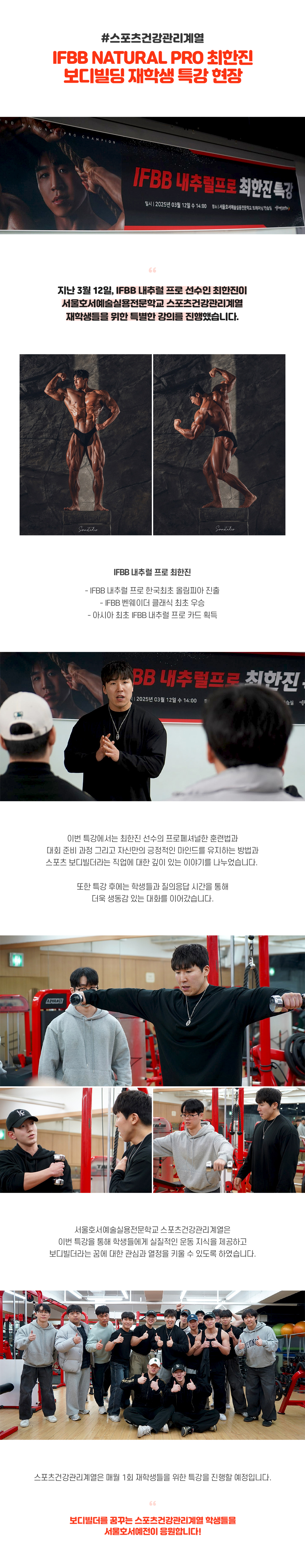 지난 3월 12일, IFBB 내추럴 프로 선수인 최한진이 서울호서예술실용전문학교 스포츠건강관리계열 재학생들을 위한 특별한 강의를 진행했습니다. [IFBB 내추럴 프로 최한진] - IFBB 내추럴 프로 한국최초 올림피아 진출 / IFBB 벤웨이더 클래식 최초 우승 / 아시아 최초 IFBB 내추럴 프로 카드 획득