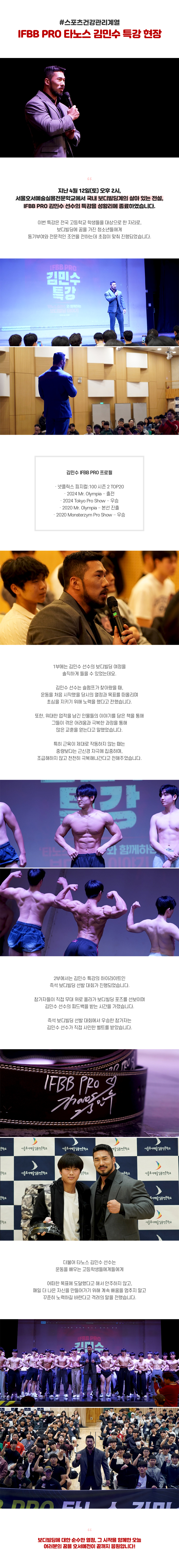 지난 4월 12일(토) 오후 2시, 서울호서예술실용전문학교에서 국내 보디빌딩계의 살아 있는 전설, IFBB PRO 김민수 선수의 특강을 성황리에 종료하였습니다. 이번 특강은 전국 고등학교 학생들을 대상으로 한 자리로, 보디빌딩에 꿈을 가진 청소년들에게 동기부여와 전문적인 조언을 전하는데 초점이 맞춰 진행되었습니다. [김민수 IFBB PRO 대표 프로필] · 넷플릭스 피지컬:100 시즌 2 TOP20 / · 2024 Mr. Olympia – 출전 / · 2024 Tokyo Pro Show – 우승 / · 2020 Mr. Olympia – 본선 진출 / · 2020 Monsterzym Pro Show – 우승