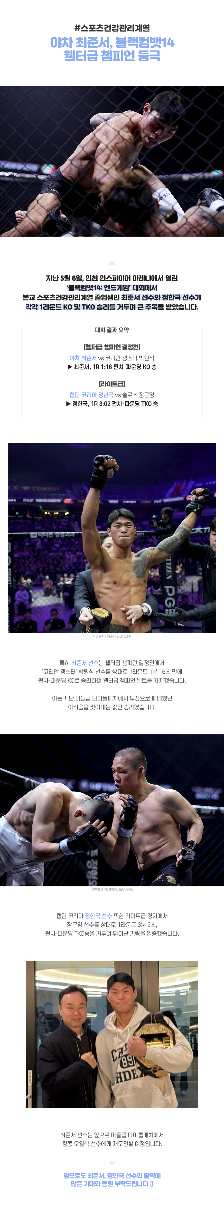 지난 5월 6일, 인천 인스파이어 아레나에서 열린 ‘블랙컴뱃14: 엔드게임’ 대회에서 서울호서예술실용전문학교 스포츠건강관리계열 졸업생인 최준서 선수와 정한국 선수가 각각 1라운드 KO 및 TKO 승리를 거두며 큰 주목을 받았습니다. 특히 최준서 선수는 웰터급 챔피언 결정전에서 ‘코리안 갱스터’ 박원식 선수를 상대로 1라운드 1분 16초 만에 펀치-파운딩 KO로 승리하며 웰터급 챔피언 벨트를 차지했습니다.