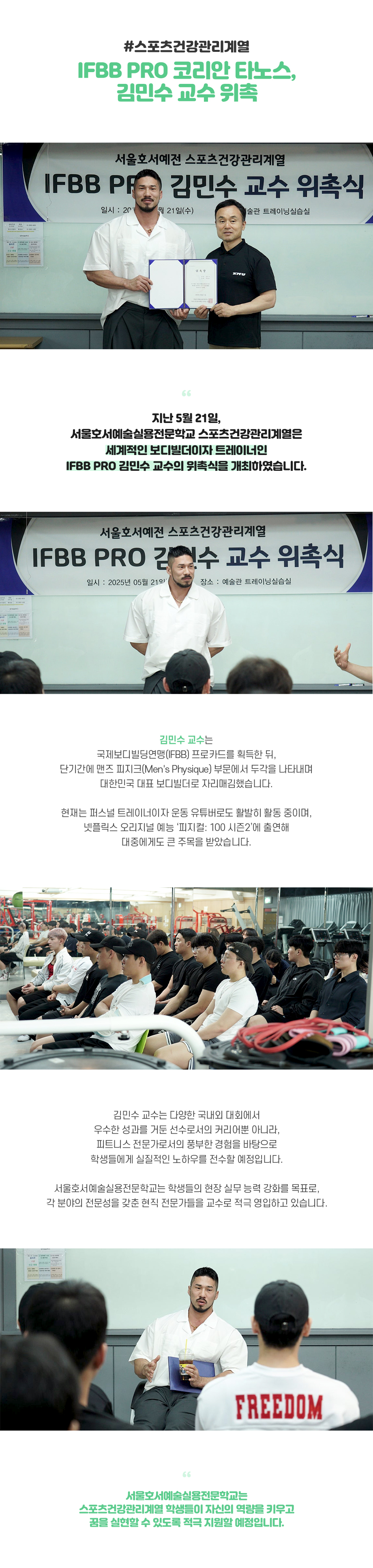 서울호서예술실용전문학교 스포츠건강관리계열은 지난 5월 21일, 세계적인 보디빌더이자 트레이너인 IFBB PRO 김민수 교수의 위촉식을 개최하였습니다. 김민수 교수는 국제보디빌딩연맹(IFBB) 프로카드를 획득한 뒤, 단기간에 맨즈 피지크(Men's Physique) 부문에서 두각을 나타내며 대한민국 대표 보디빌더로 자리매김했습니다. 현재는 퍼스널 트레이너이자 운동 유튜버로도 활발히 활동 중이며, 넷플릭스 오리지널 예능 ‘피지컬: 100 시즌2’에 출연해 대중에게도 큰 주목을 받았습니다.