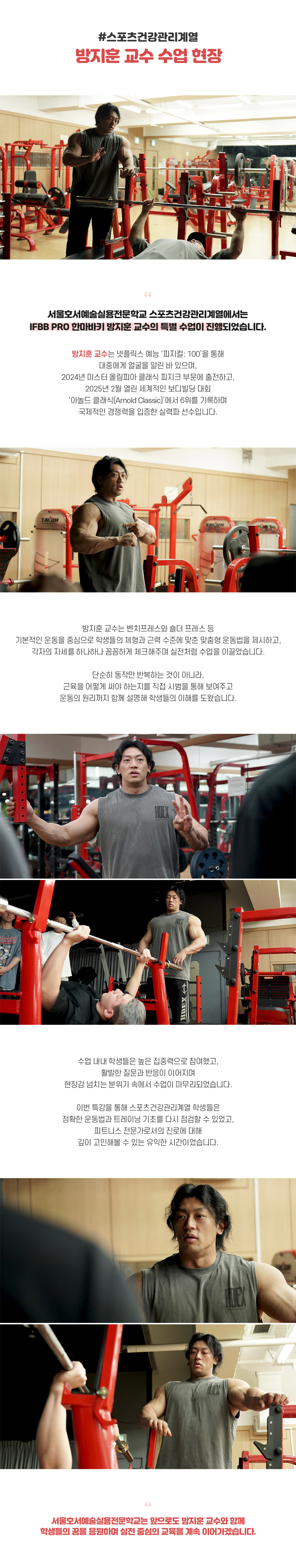 서울호서예술실용전문학교 스포츠건강관리계열에서는 IFBB PRO 한마바키 방지훈 교수의 특별 수업이 진행되었습니다. 방지훈 교수는 넷플릭스 예능 ‘피지컬: 100’을 통해 대중에게 얼굴을 알린 바 있으며, 2024년 미스터 올림피아 클래식 피지크 부문에 출전하고, 2025년 2월 열린 세계적인 보디빌딩 대회 ‘아놀드 클래식(Arnold Classic)’에서 6위를 기록하며 국제적인 경쟁력을 입증한 실력파 선수입니다.