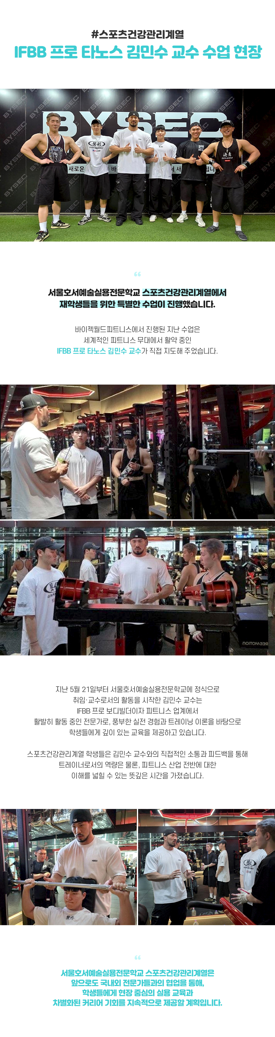 서울호서예술실용전문학교 스포츠건강관리계열에서 재학생들을 위한 특별한 수업이 진행했습니다. 바이젝월드피트니스에서 진행된 지난 수업은 세계적인 피트니스 무대에서 활약 중인 IFBB 프로 타노스 김민수 교수가 직접 지도해 주었습니다.