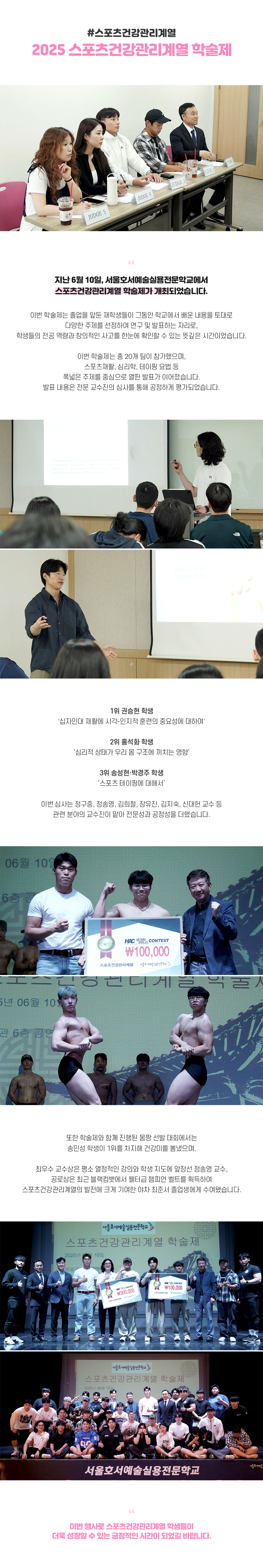 지난 6월 10일, 서울호서예술실용전문학교에서 스포츠건강관리계열 학술제가 개최되었습니다. 이번 학술제는 졸업을 앞둔 재학생들이 그동안 학교에서 배운 내용을 토대로 다양한 주제를 선정하여 연구 및 발표하는 자리로, 학생들의 전공 역량과 창의적인 사고를 한눈에 확인할 수 있는 뜻깊은 시간이었습니다.