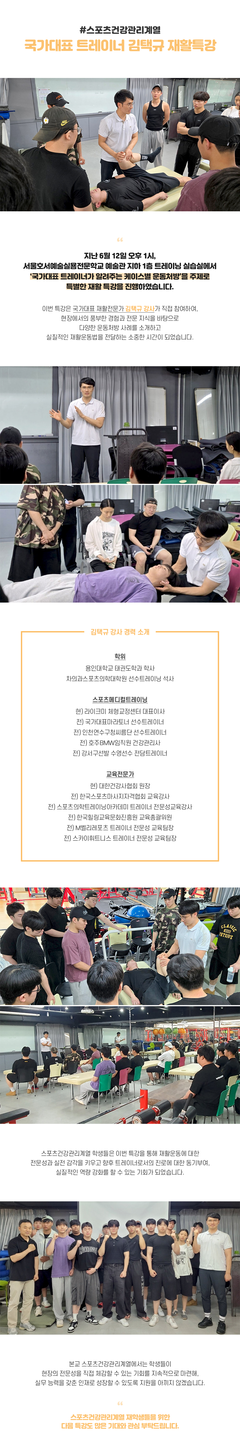 지난 6월 12일 오후 1시, 서울호서예술실용전문학교 예술관 지하 1층 트레이닝 실습실에서 ‘국가대표 트레이너가 알려주는 케이스별 운동처방’을 주제로 특별한 재활 특강을 진행하였습니다. 이번 특강은 국가대표 재활전문가 김택규 강사가 직접 참여하여, 현장에서의 풍부한 경험과 전문 지식을 바탕으로 다양한 운동처방 사례를 소개하고 실질적인 재활운동법을 전달하는 소중한 시간이 되었습니다.