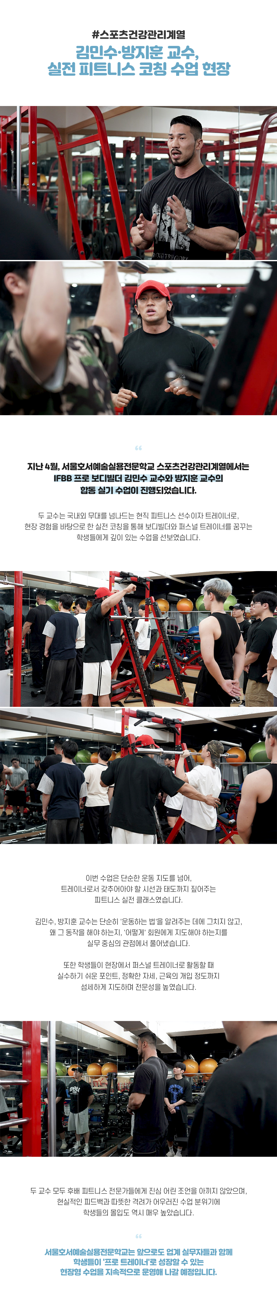 지난 4월, 서울호서예술실용전문학교 스포츠건강관리계열에서는 IFBB 프로 보디빌더 김민수 교수와 방지훈 교수의 합동 실기 수업이 진행되었습니다. 두 교수는 국내외 무대를 넘나드는 현직 피트니스 선수이자 트레이너로, 현장 경험을 바탕으로 한 실전 코칭을 통해 보디빌더와 퍼스널 트레이너를 꿈꾸는 학생들에게 깊이 있는 수업을 선보였습니다.