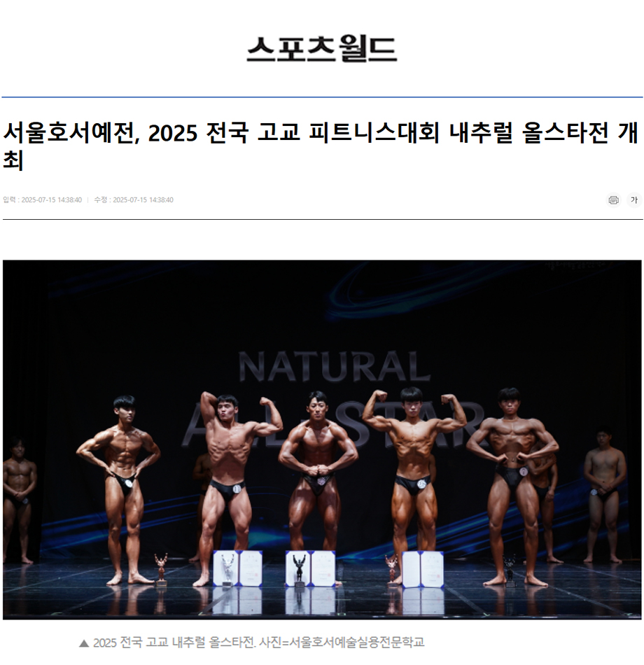서울호서예술실용전문학교(이하 서울호서예전) 스포츠건강관리계열이 주최·주관한 전국 고교 피트니스 대회 ‘2025 전국 고교 내추럴 올스타전’이 지난 7월 12일 토요일 서울호서예전 예술관에서 개최됐다고 15일 밝혔다.