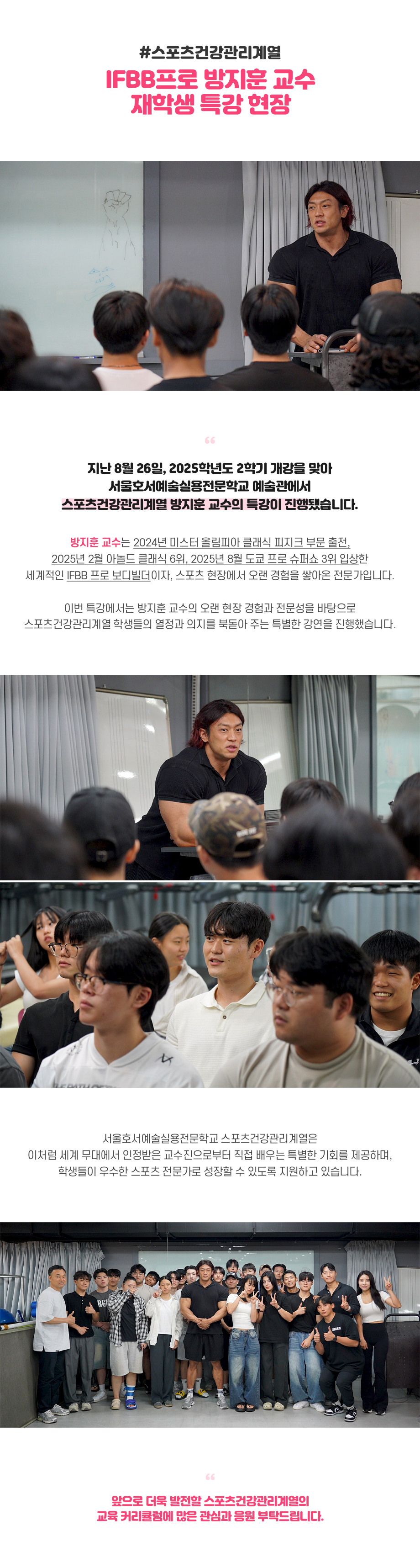 지난 8월 26일, 서울호서예술실용전문학교 예술관에서 2025학년도 2학기 개강을 맞아 스포츠건강관리계열 방지훈 교수의 특강이 진행됐습니다. 방지훈 교수는 2024년 미스터 올림피아 클래식 피지크 부문 출전, 2025년 2월 아놀드 클래식 6위, 2025년 8월 도쿄 프로 슈퍼쇼 3위 입상한 세계적인 IFBB 프로 보디빌더이자, 스포츠 현장에서 오랜 경험을 쌓아온 전문가입니다.