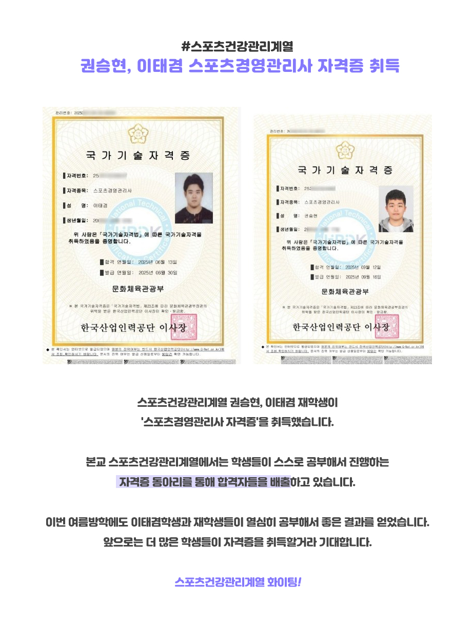 스포츠건강관리계열 권승현, 이태겸 재학생이 '스포츠경영관리사 자격증'을 취득했습니다.