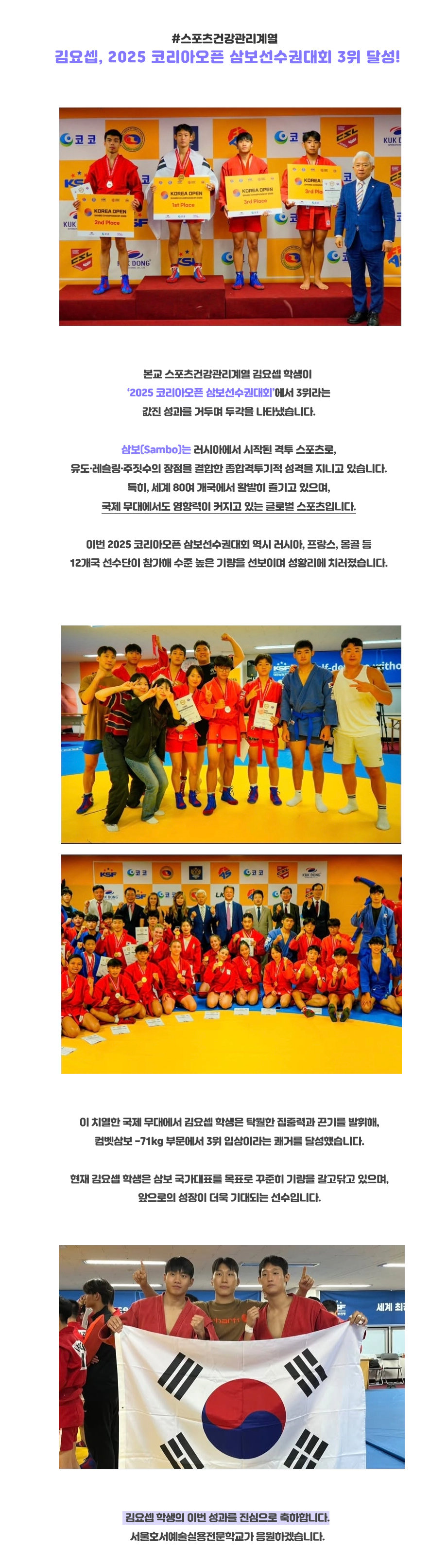본교 스포츠건강관리계열 김요셉 학생이 ‘2025 코리아오픈 삼보선수권대회’에서 3위라는 값진 성과를 거두며 두각을 나타냈습니다.