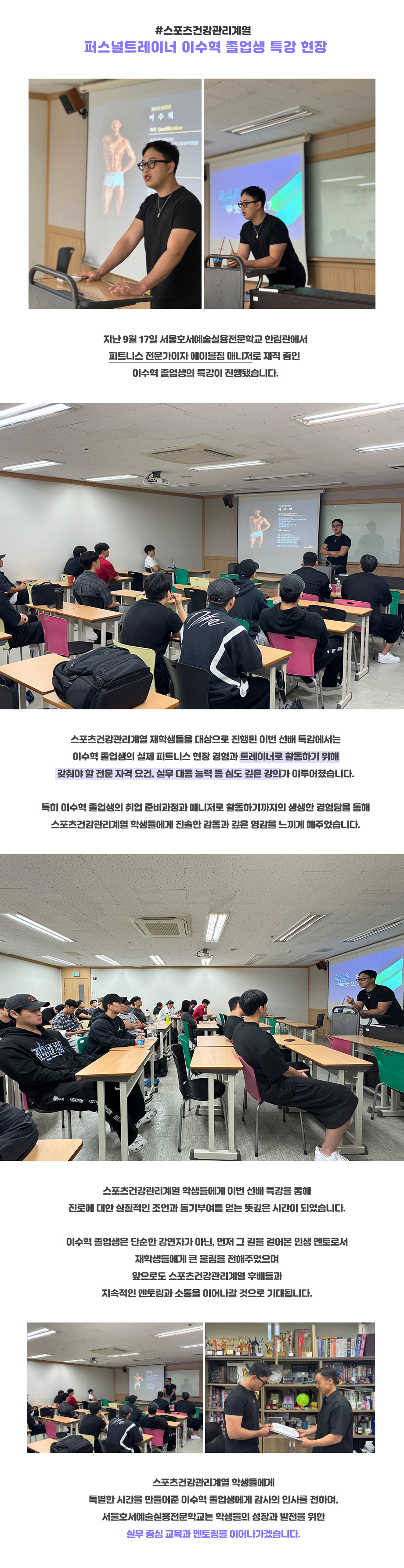 지난 9월 17일 서울호서예술실용전문학교 한림관에서 피트니스 전문가이자 에이블짐 매니저로 재직 중인 이수혁 졸업생의 특강이 진행됐습니다.