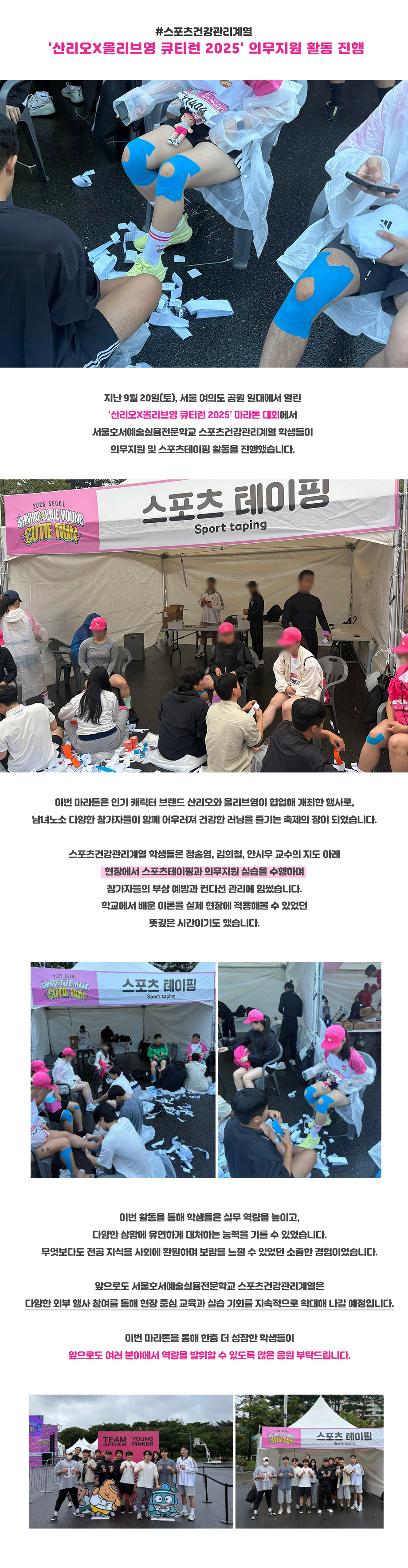 서울 여의도 공원 일대에서 열린 ‘산리오X올리브영 큐티런 2025’ 마라톤 대회에서 서울호서예술실용전문학교 스포츠건강관리계열 학생들이 의무지원 및 스포츠테이핑 활동을 진행했습니다.