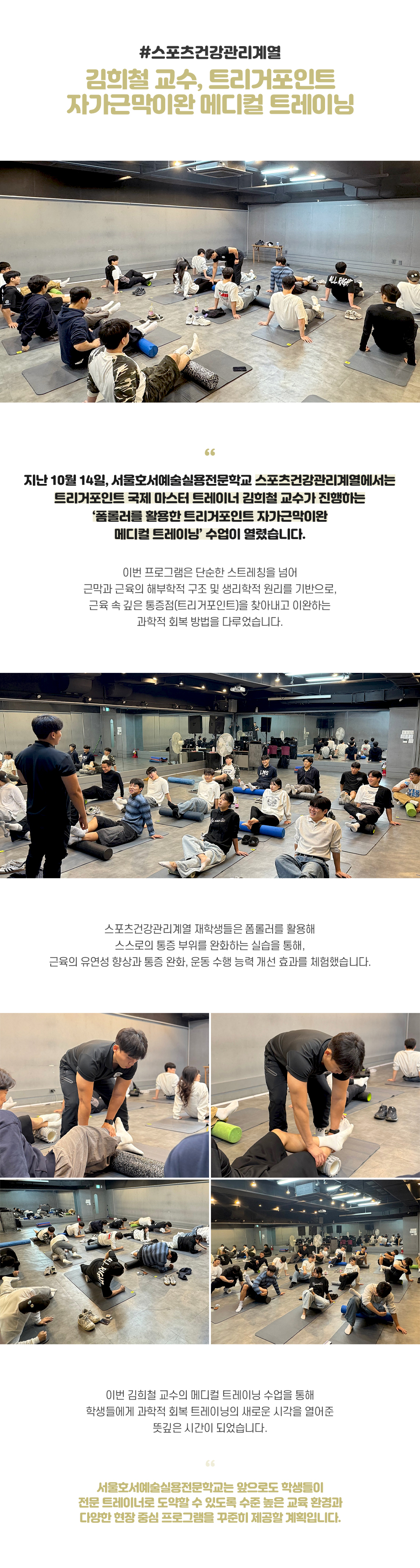 지난 10월 14일, 서울호서예술실용전문학교 스포츠건강관리계열에서는 트리거포인트 국제 마스터 트레이너 김희철 교수가 진행하는 ‘폼롤러를 활용한 트리거포인트 자가근막이완 메디컬 트레이닝’ 수업이 열렸습니다.