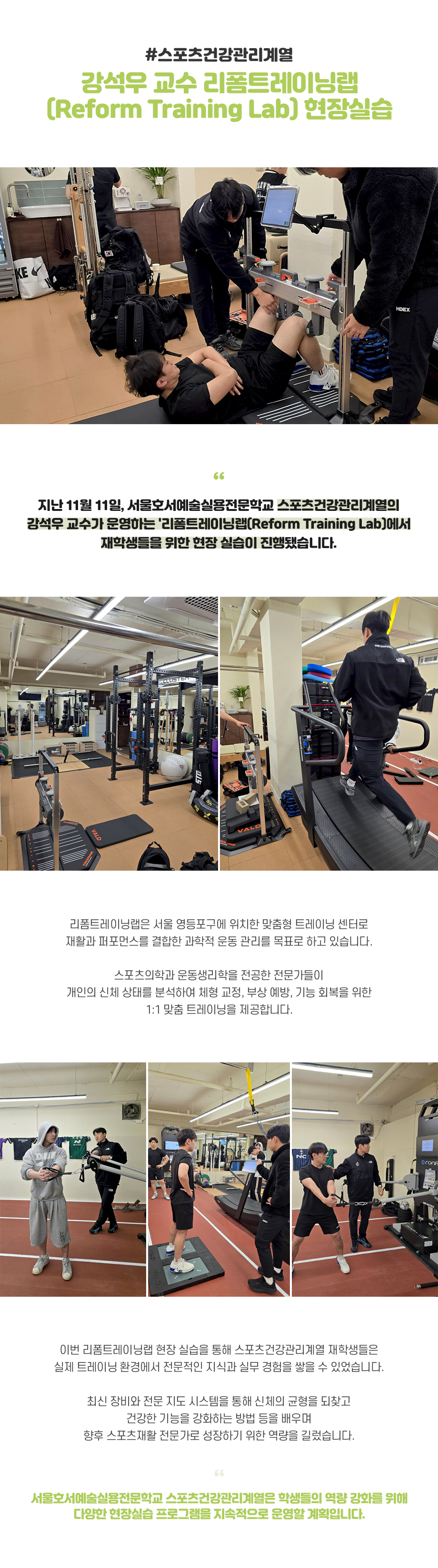 지난 11월 11일, 서울호서예술실용전문학교 스포츠건강관리계열의 강석우 교수가 운영하는 '리폼트레이닝랩(Reform Training Lab)에서 재학생들을 위한 현장 실습이 진행됐습니다.