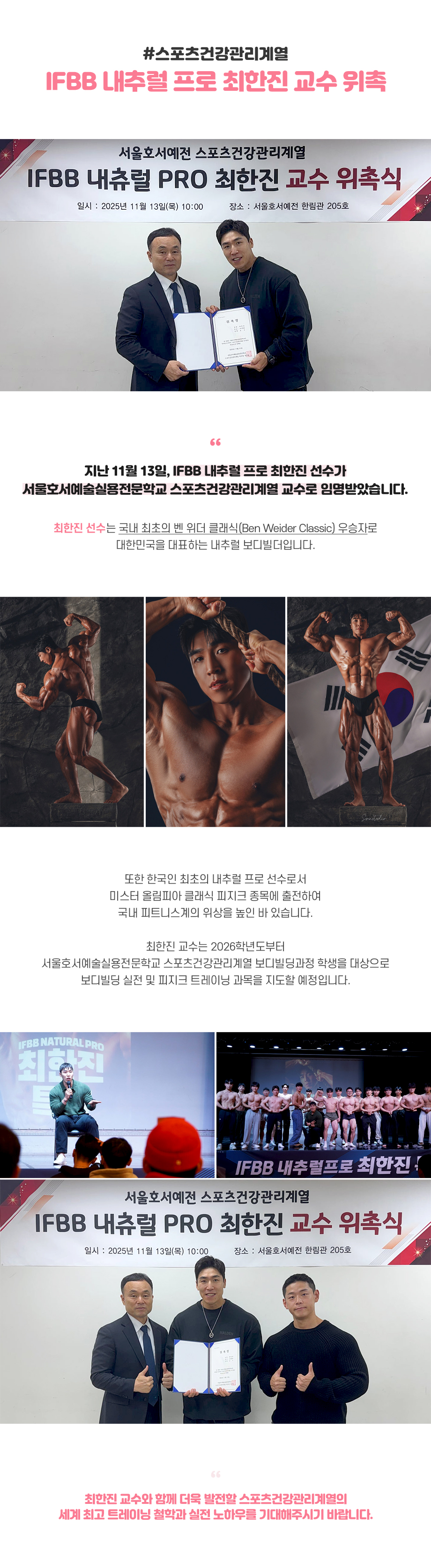 지난 11월 13일, IFBB 내추럴 프로 최한진 선수가 서울호서예술실용전문학교 스포츠건강관리계열 교수로 임명받았습니다. 최한진 선수는 국내 최초의 벤 위더 클래식(Ben Weider Classic) 우승자로 대한민국을 대표하는 내추럴 보디빌더입니다.