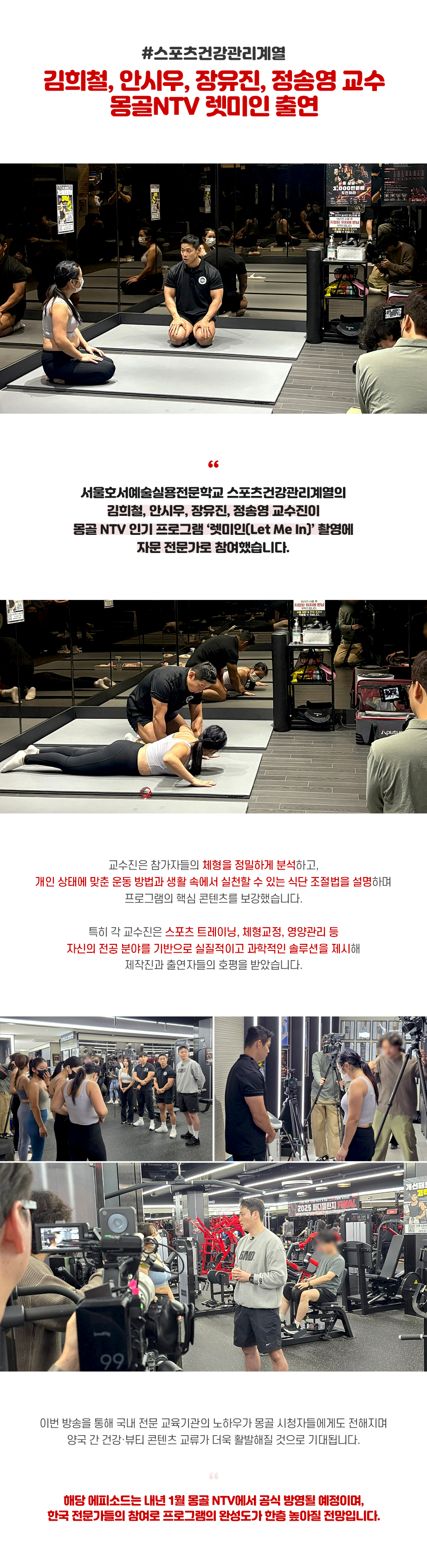 서울호서예술실용전문학교 스포츠건강관리계열의 김희철, 안시우, 장유진, 정송영 교수진이 몽골 NTV 인기 프로그램 ‘렛미인(Let Me In)’ 촬영에 자문 전문가로 참여했습니다.