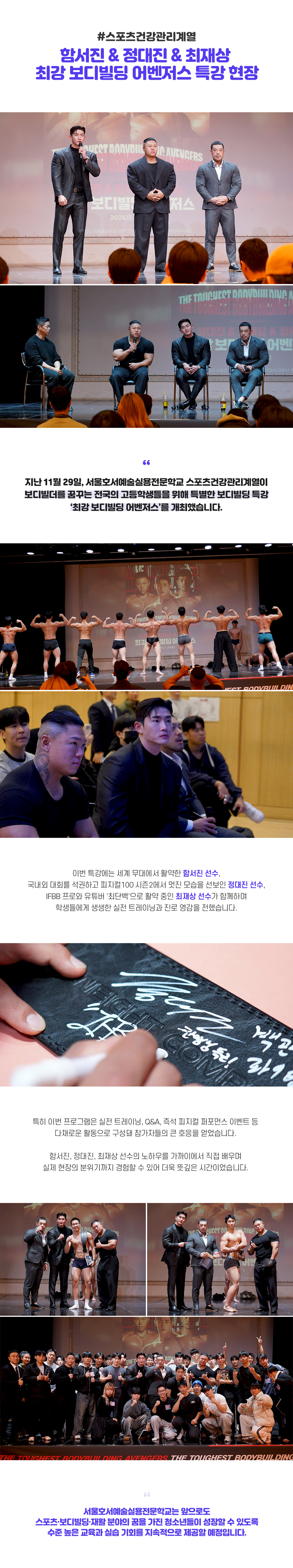 지난 11월 29일, 서울호서예술실용전문학교 스포츠건강관리계열이 보디빌더를 꿈꾸는 전국의 고등학생들을 위해 특별한 보디빌딩 특강 ‘최강 보디빌딩 어벤저스’를 개최했습니다.