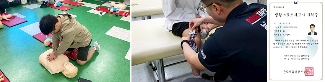 국가자격증인 생활 스포츠 지도사부터 민간자격증인 스포츠재활지도자, 운동처방사, CES, 스포츠마사지, 스포츠테이핑 등 각 학기말 심화 과정으로 다양한 자격증을 취득 가능