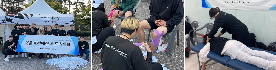 전국 규모 엘리트 스포츠 대회부터 지역 연계 생활 체육 대회 및 각종 마라톤 대회에 의무 트레이너 지원 자원 봉사 활동, 매년 교내 스포츠재활 학술대회 준비를 위해 스터디 및 관련 자격증 공부 진행