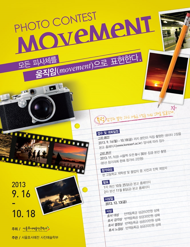 2013. 9. 16(월) - 10. 18(금)까지 본인이 직접 촬영한 사진 2장을 본교 홈페이지(http://www.koreaart.ac.kr/contest/photo.asp) 양식에 따라 접수