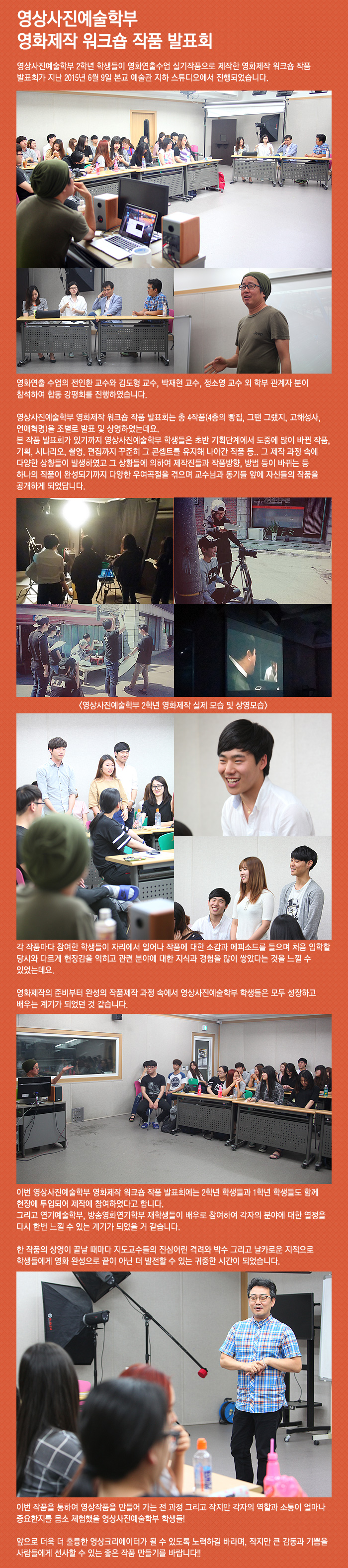영상사진예술학부 2학년 학생들이 영화연출수업 실기작품으로 제작한 영화제작 워크숍 작품 발표회가 지난 2015년 6월 9일 본교 예술관 지하 스튜디오에서 진행되었습니다.
