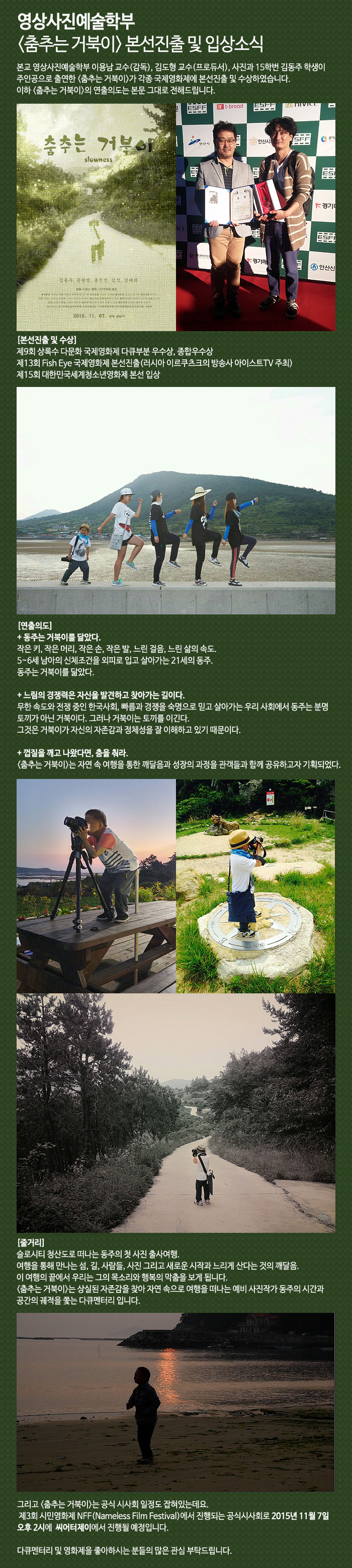 본교 영상사진예술학부 이용남 교수(감독), 김도형 교수(프로듀서), 사진과 15학번 김동주 학생이 주인공으로 출연한 <춤추는 거북이>가 각종 국제영화제에 본선진출 및 수상하였습니다.