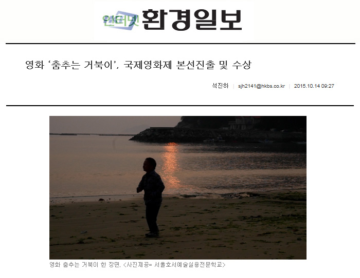[환경일보] 석진하 기자 = 서울호서예술실용전문학교(이하 서울호서예전)영상사진예술학부 이용남교수 감독, 김도형교수 프로듀서, 사진과 15학번 김동주 학생이 주인공인 영화 <춤추는 거북이>가 제9회 상록수 다문화 국제영화제 다큐부문 우수상과 종합우수상, 제13회 Fish Eye 국제영화제 본선진출(러시아 이르쿠츠크의 방송사 아이스트TV주최), 제15회 대한민국세계청소년영화제 본선에 진출하였다.