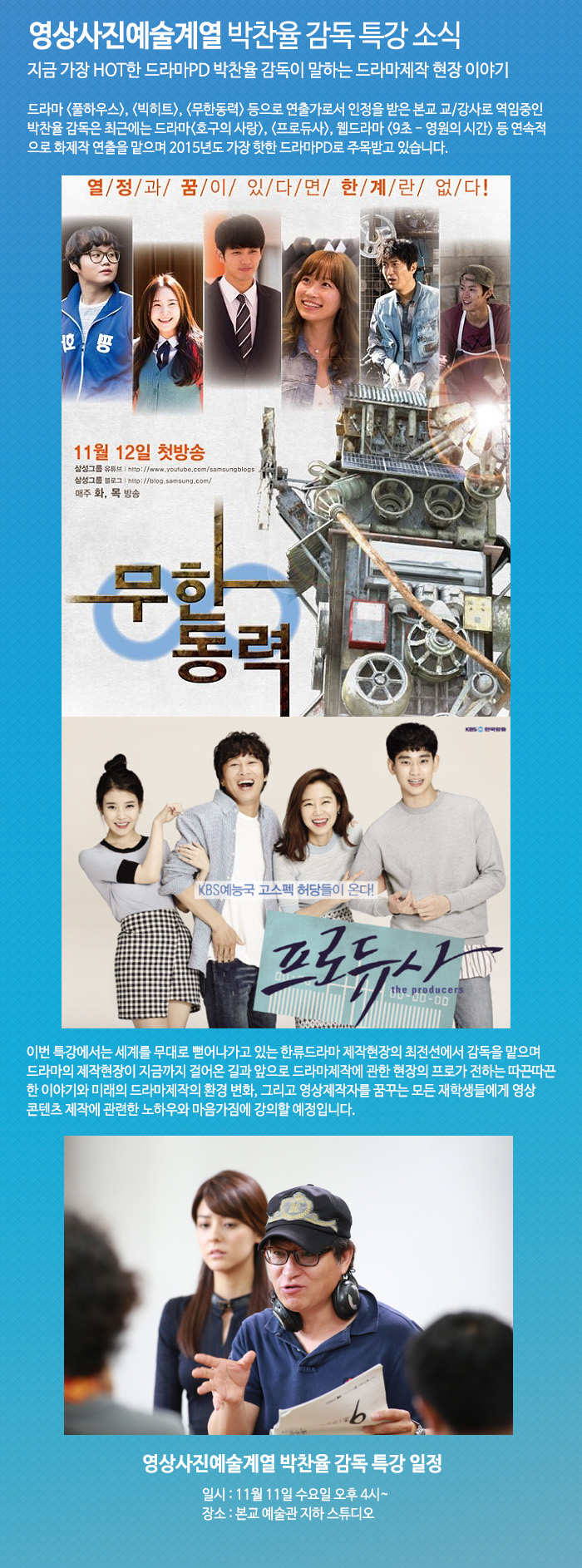 드라마 <풀하우스>, <빅히트>, <무한동력> 등으로 연출가로서 인정을 받은 본교 교/강사로 역임중인 박찬율 감독은 최근에는 드라마<호구의 사랑>, <프로듀사>, 웹드라마 <9초 - 영원의 시간> 등 연속적으로 화제작 연출을 맡으며 2015년도 가장 핫한 드라마PD로 주목받고 있습니다.