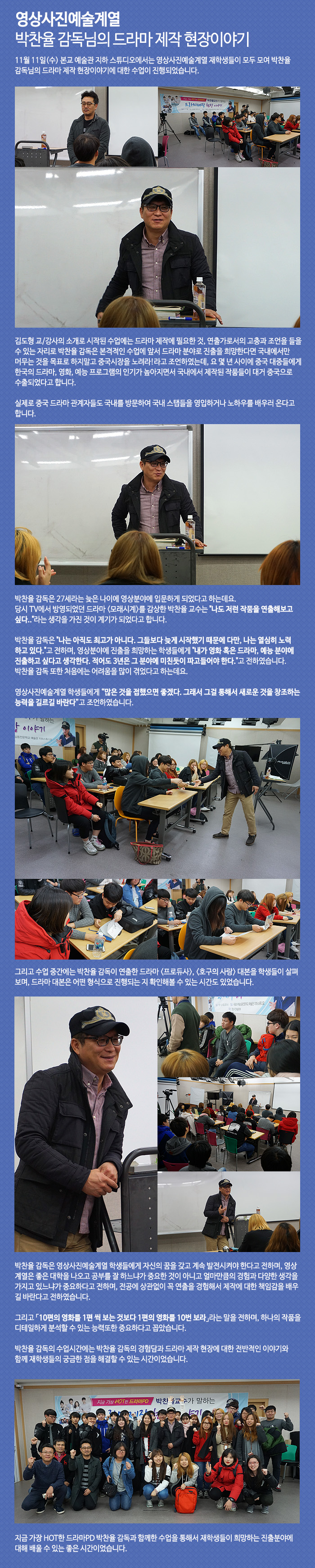 11월 11일(수) 본교 예술관 지하 스튜디오에서는 영상사진예술학부 재학생들이 모두 모여 박찬율 감독님의 드라마 제작 현장이야기에 대한 수업이 진행되었습니다.