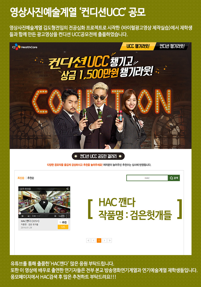영상사진예술계열 김도형전임의 전공심화 프로젝트로 시작한 <바이럴광고영상 제작실습>에서 재학생들과 함께 만든 광고영상을 컨디션 UCC공모전에 출품하였습니다.