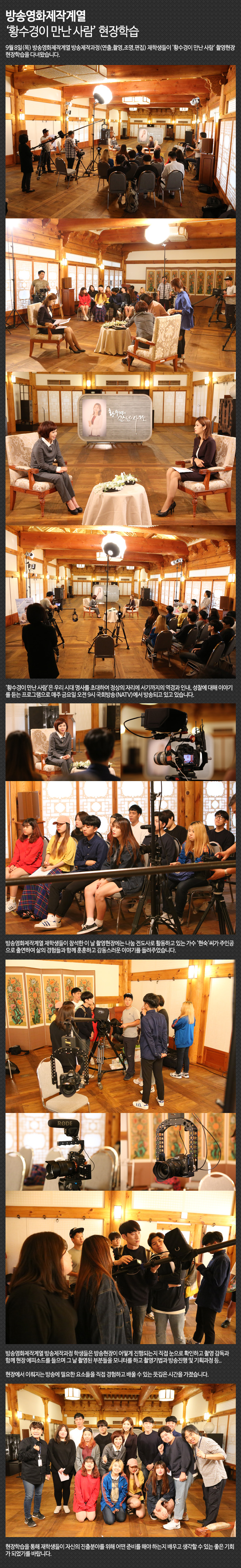 9월 8일(목) 방송영화제작계열 방송제작과정(연출,촬영,조명,편집) 재학생들이 '황수경이 만난 사람' 촬영현장 현장학습을 다녀왔습니다.