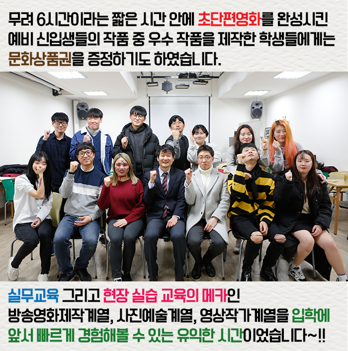 2월 3일(토) 본교에서는 방송영화제작계열, 사진예술계열, 영상작가계열 예비 신입생들과 함께 <6시간 만에 영화만들기>라는 주제로 1일 예비학교가 진행되었습니다.