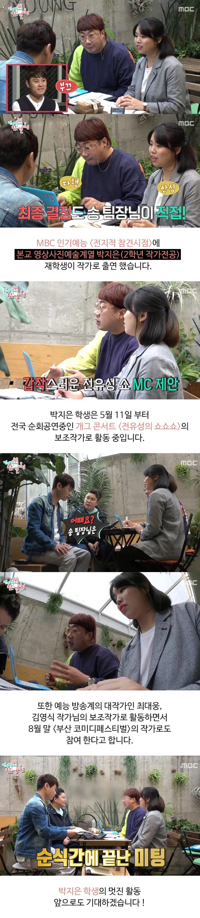 MBC 인기예능 '전지적 참견시점' 에 본교 영상사진예술계열 박지은(2학년 작가전공) 재학생이 작가로 출연 했습니다.