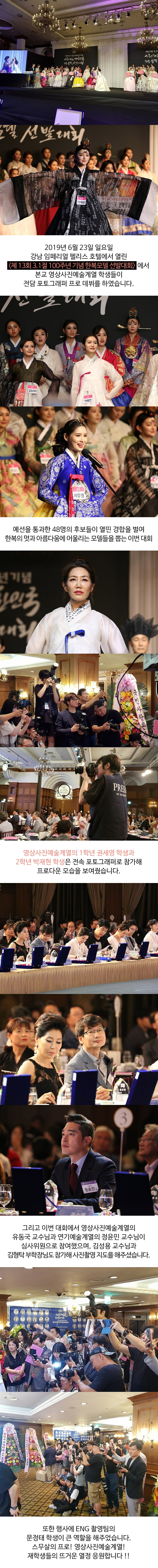 2019년 6월 30일 일요일 강남 임페리얼 팰리스 호텔에서 개최된 '제 13회 3.1절 100주년 기념 사랑해요 대한민국 한복모델선발대회'에서 본교 영상사진예술계열 학생들이 전담 포토그래퍼 프로 데뷔를 하였습니다.