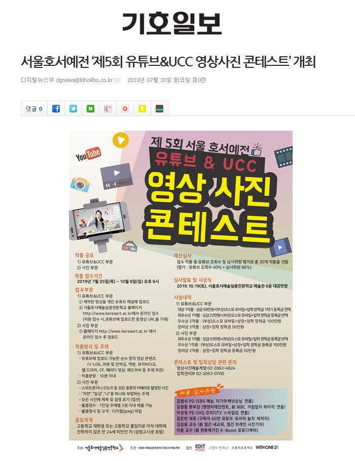 서울호서예술실용전문학교(이하 서울호서예전) 방송영화제작계열 및 유튜브제작계열, 사진예술계열에서 ‘제5회 유튜브&UCC 영상사진 콘테스트”를 개최한다고 학교 관계자가 밝혔다.